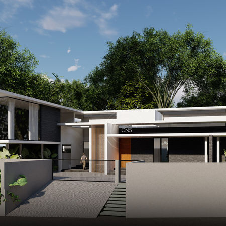 This contemporary residence embodies a harmonious blend of sleek modernity and functional design, featuring clean lines, open-plan spaces, and expansive glass facades that invite natural light and integrate indoor and outdoor living